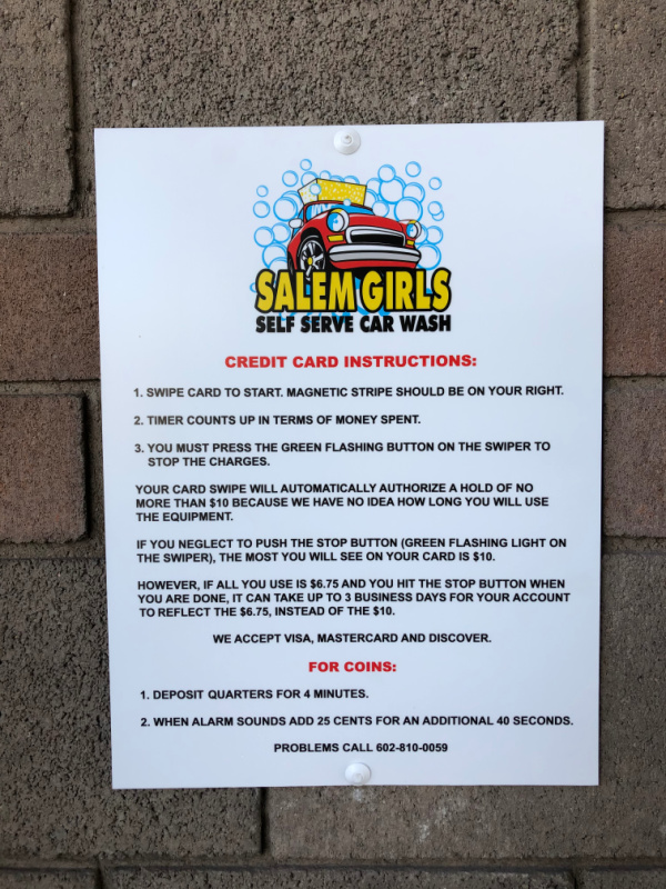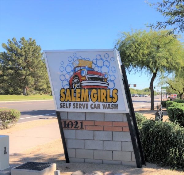 Welcome to Salem Girls Self Serve Carwash. We are a 4 bay self serve carwash open 24/7. Salem Carwash is located at 1021 W Warner Rd Tempe, AZ 85284. We are just 1 mile east of the I-10 & Warner Road on the south side of the road. Do you have a motor home that you need to wash? We can accommodate that. We have a motor home bay just for you! Our facility is clean, well lit and monitored 24/7 by security cameras. Salem Carwash accepts MasterCard, Visa and Discover in the bays & vacuums as well as cash/coin. We have a free rug beater for your floor mats and vacuums. If you need cloth towels, window cleaner, Armor All or air fresheners we have you covered!